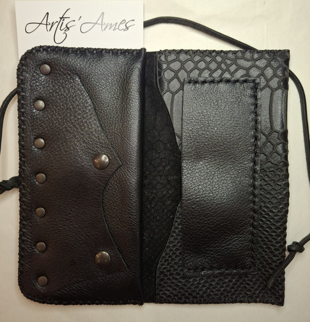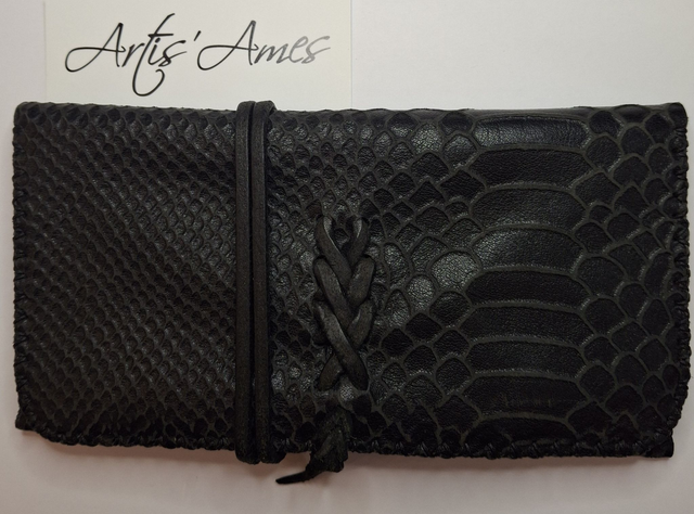 Une jolie blague à tabac en cuir noir rectangulaire. Se ferme avec un lacet en cuir.