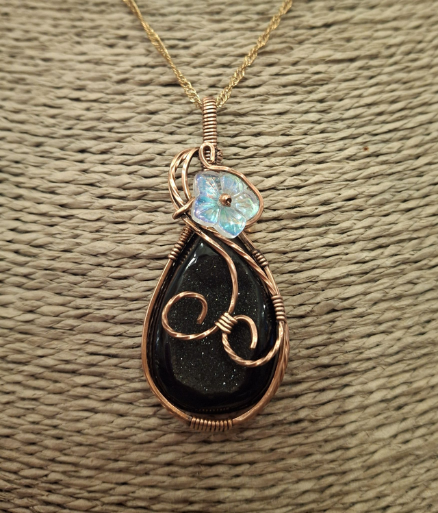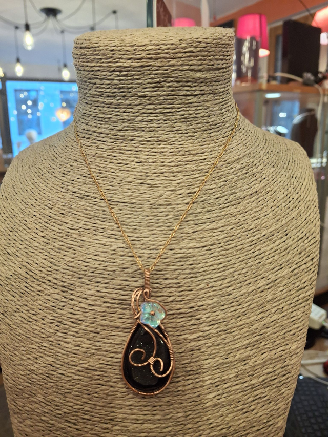 Un joli collier composé d'une chaîne fine et d'un pendentif en cuivre. Bordé de fils de cuivre torsadés, l'onyx à cristaux brille intensément sous la perle fantaisie en forme de fleur aux reflets rose et bleu.