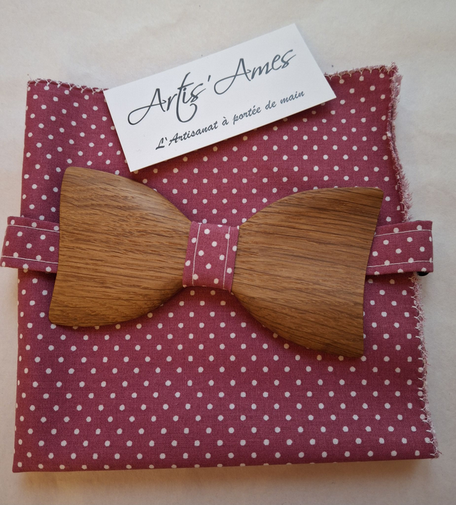 Noeud Papillon en Chêne avec pochette rose à pois blancs