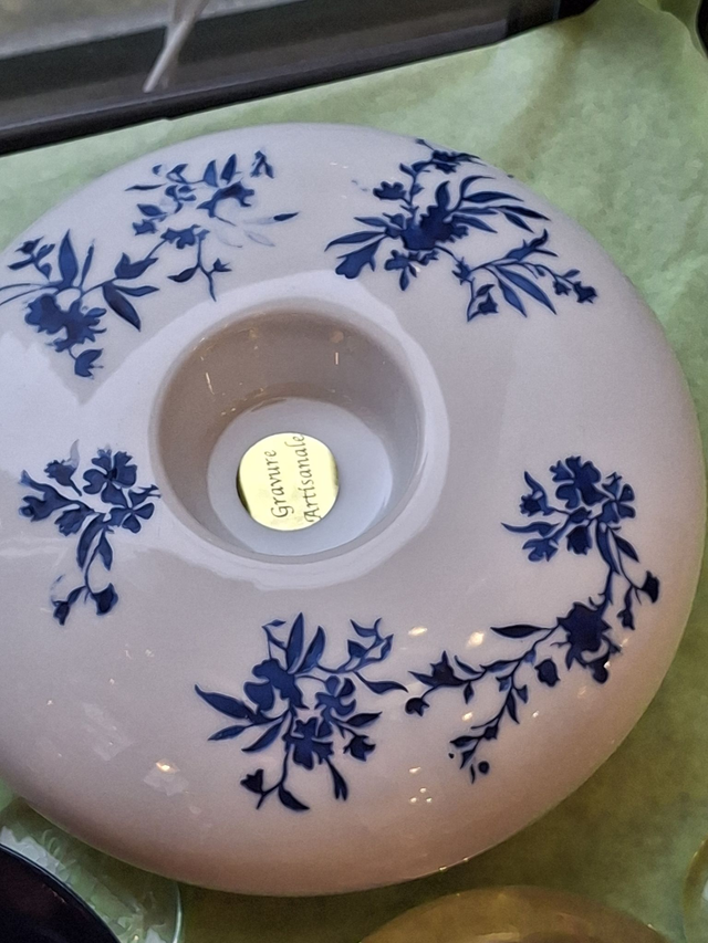 Photophore bombé en porcelaine blanche gravée. Motif : Feuillages bleus. Gravure artisanale à la main. Aucune gravure laser.