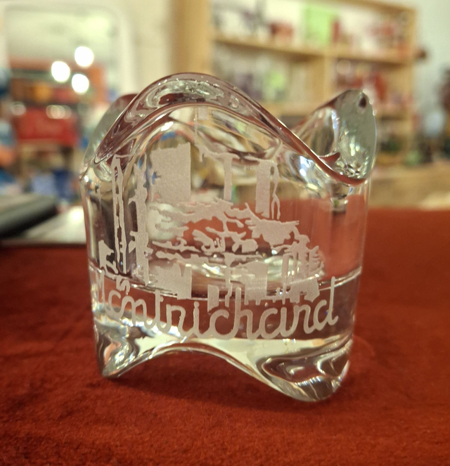 Photophore cylindrique ondulé en verre pour bougie chauffe plat. Motif : le Donjon de Montrichard.
