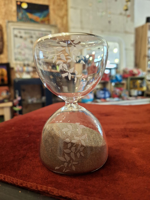 Sablier en verre clair. Motif : Feuillages. Durée : 3 minutes. Hauteur : 10 cm. Décoratif et utile. Gravure artisanale à la main. Aucune gravure laser.